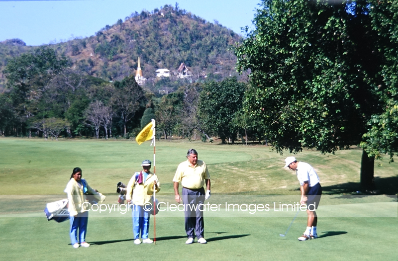 Next Peter travels up to see the River Kwai Bridge and ponder over the 30,000 lives lost on the railway. Whilst there he stops off at the Nichigo Course, which is close by and has a miniature replica bridge on one of its holes. the attraction there was the opportunity to join Miss Thailand’s visist to the course where they discuss putting tactics.